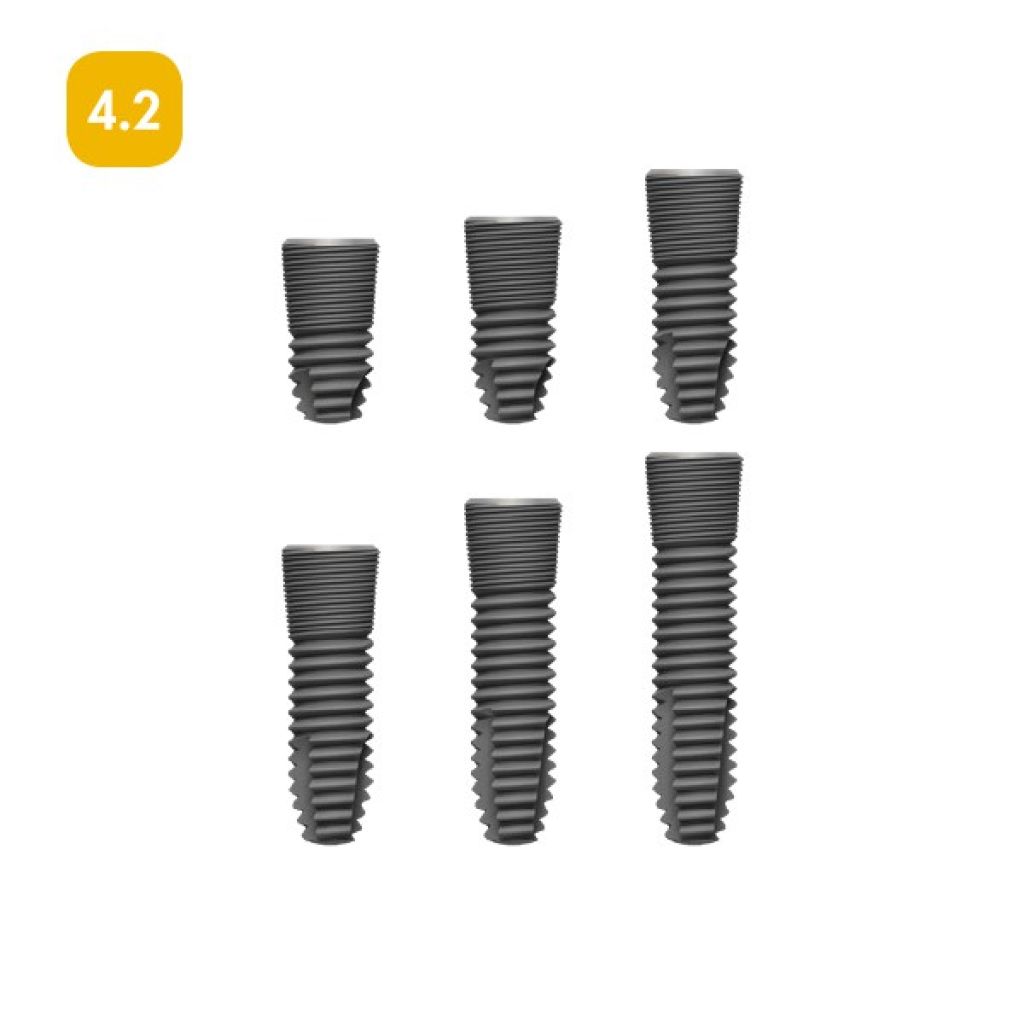 Імплантати доступні у широкому діапазоні форм, діаметрів та довжин, в тому числі для ситуацій з обмеженим доступним простором і(або) кількістю кісткової тканини.