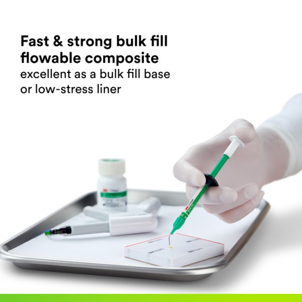 Текучий реставраційний матеріал Filtek ™ Bulk Fill є рідким, тверднучим на світлі, рентгеноконтрастним композитом низької в'язкості. Цей текучий матеріал є напівпрозорим і забезпечує можливість полімеризації глибиною до 4 мм.